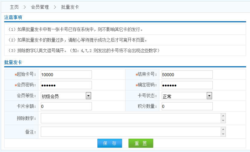 操作流程: 按規(guī)則填寫參數(shù)------>點(diǎn)擊保存------>批量發(fā)卡成功